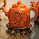 Zisha Hu, or Purple Sand Tea Pot, is a unique Chinese art form that developed during the Song dynasty (960-1279), but reached the height of its fame during the early Ming Dynasty (960-1644) through the Qing Dynasty (1644-1911). This very elegant, but simple style of earthenware became increasingly popular as tea preparation itself moved towards simplicity. The process of preparing tea during the earlier Tang Dynasty (618-907) involved grinding of leaves and the addition of incense. As this complex method began to fall out of favor it was replaced with the use of simple, but wonderful whole tea leaves and buds. The unglazed and uncolored purple sand clay teapot proved it could best capture the real color and fragrance of this new style of tea. In addition, its aesthetics reflected the cultural and philosophical ideas of the times. Transcending its purpose of brewing tea, zisha tea ware became a symbol of simplistic beauty.
